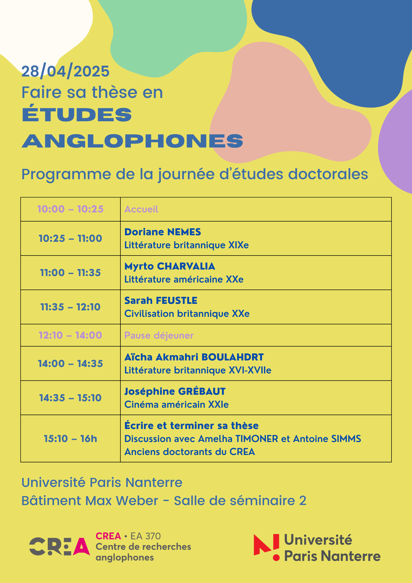 10:00 – 10:25 Accueil 10:25 – 11:00 Doriane NEMES - Littérature britannique XIXe 11:00 – 11:35 Myrto CHARVALIA - Littérature américaine XXe 11:35 – 12:10 Sarah FEUSTLE - Civilisation britannique XXe 12:10 – 14:00 Pause déjeuner 14:00 – 14:35 Aïcha Akmahri BOULAHDRT - Littérature britannique XVI-XVIIe 14:35 – 15:10 Joséphine GRÉBAUT - Cinéma américain XXIe 15:10 – 16h Écrire et terminer sa thèse – Discussion avec Amelha TIMONER et Antoine SIMMS, anciens doctorants du CREA