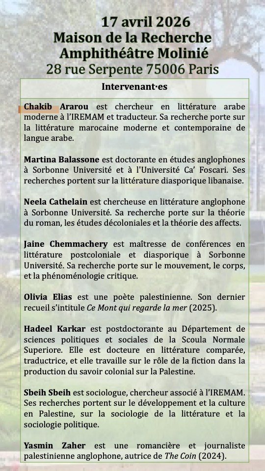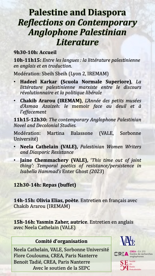 11h15-12h30: Le roman palestinien anglophone contemporain au prisme des études post/décoloniales. Modération: Martina Balassone (VALE, Sorbonne Université)