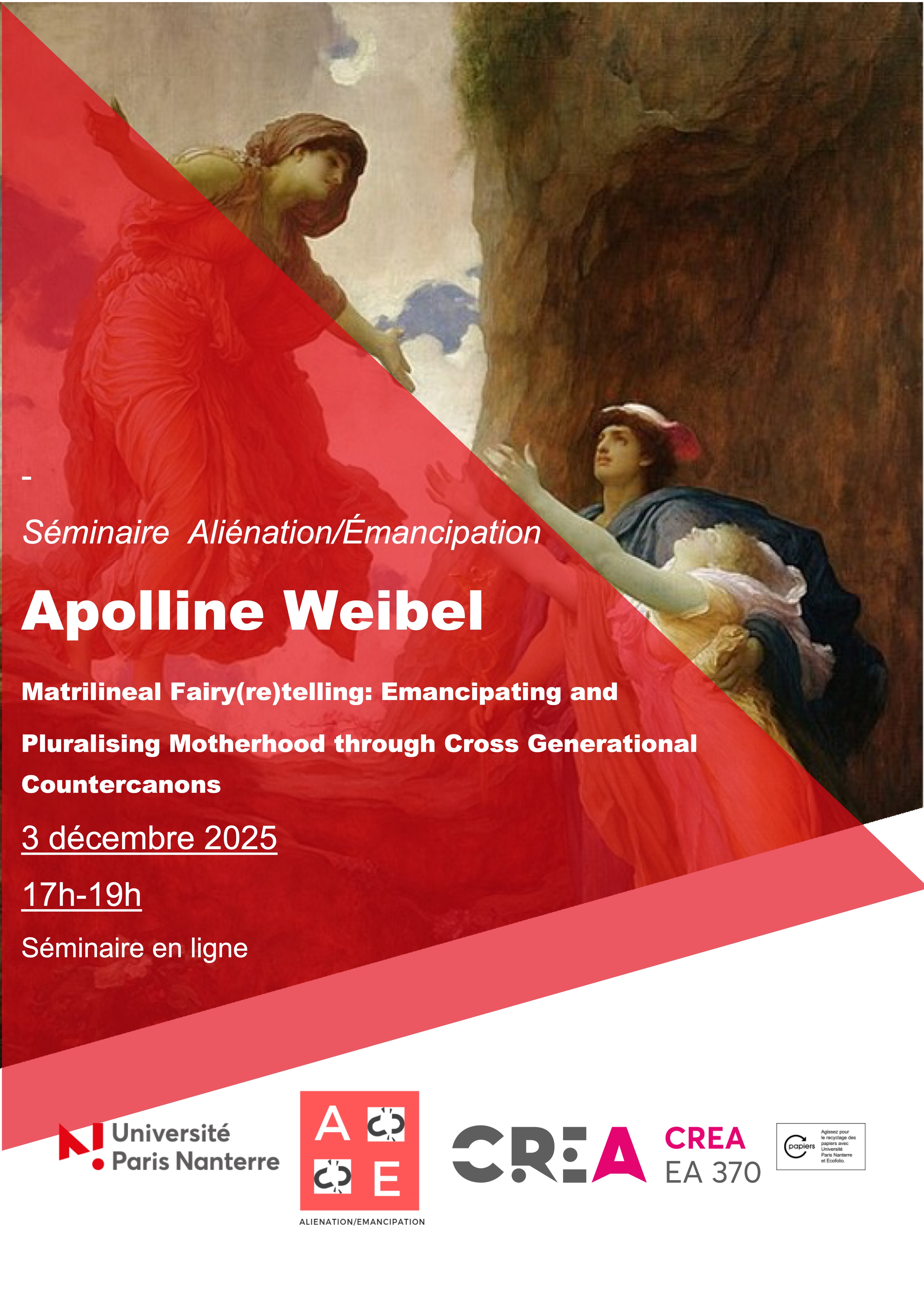 Apolline Weibel conducted her PhD at the Université Sorbonne Nouvelle, under the supervision of Professor Isabelle Alfandary. Her dissertation, which she defended in 2023, focuses on the representation of (step)motherhood in contemporary anglophone fairy-tale retellings. Apolline currently holds the position of associate professor of English at the Université Paris 1 Panthéon Sorbonne. Concurrently, she works as a postdoctoral research fellow for the interdisciplinary laboratory PRISMES (EA 4398).Mis à jour le 24 novembre 2025