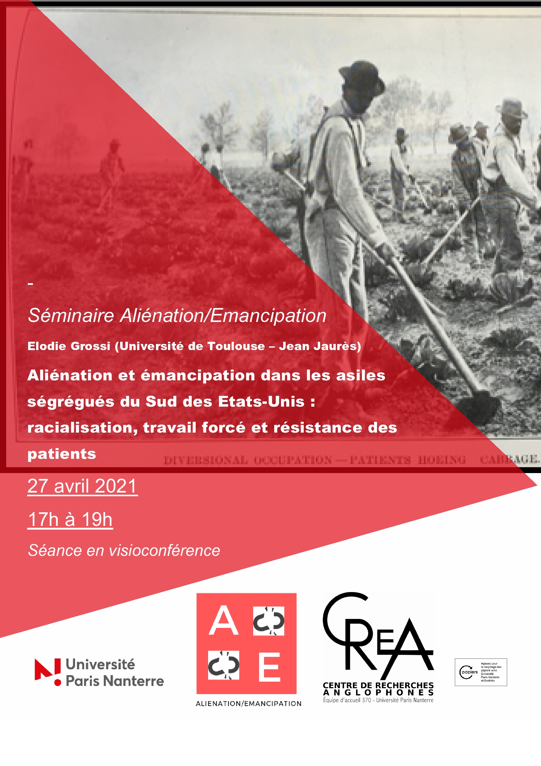 Elodie Grossi (Université Toulouse Jean-Jaurès) intervient cette semaine sur le sujet suivant : "Aliénation et émancipation dans les asiles ségrégués du Sud des États-Unis : racialisation, travail forcé et résistances des patients". La discutante sera Claire Deligny (Université Paris Nanterre).