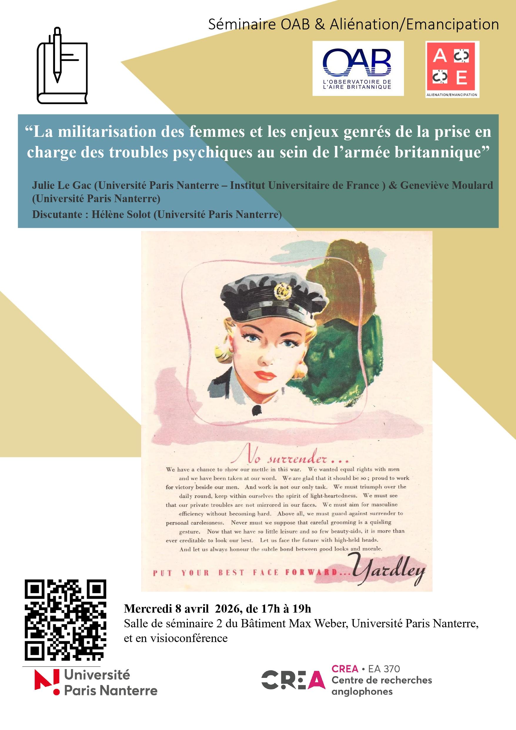 “La militarisation des femmes et les enjeux genrés de la prise en charge des troubles psychiques au sein de l’armée britannique” Julie Le Gac (Université Paris Nanterre-IUF) et Geneviève Moulard (Université Paris Nanterre)